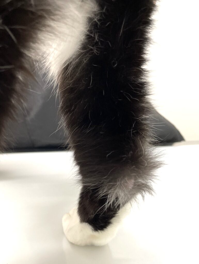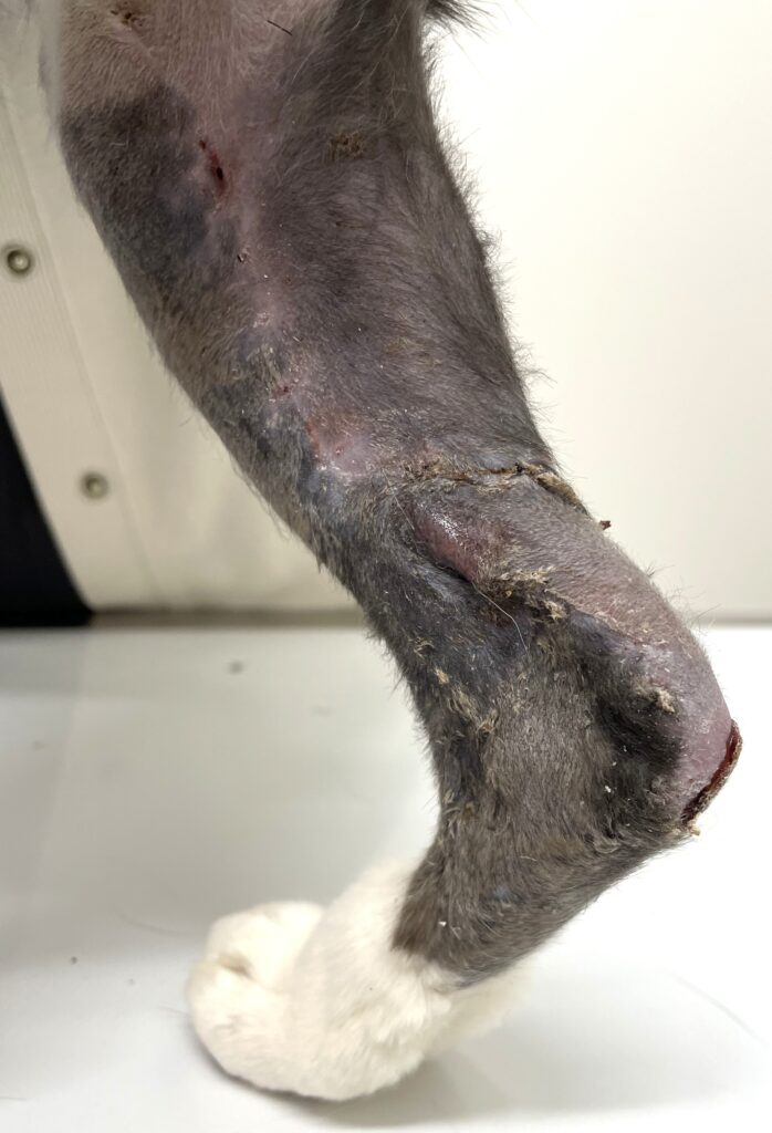 前述のように猫のかかとは最も傷が治りにくい場所で、腫瘍も広い範囲で切除の必要がありましたがどうやら骨や関節にはつながっていないようでした。腫瘍が骨に達している場合、足を失う手術(断脚)をしなければなりません。しかし皮膚であれば足は残して普通の生活をさせてあげたいですし、もちろんカラーも包帯もなしで生活させてあげたいです。そこで再発しないように腫瘍は大きく切除し、皮膚移植をする手術をしていくことになりました。